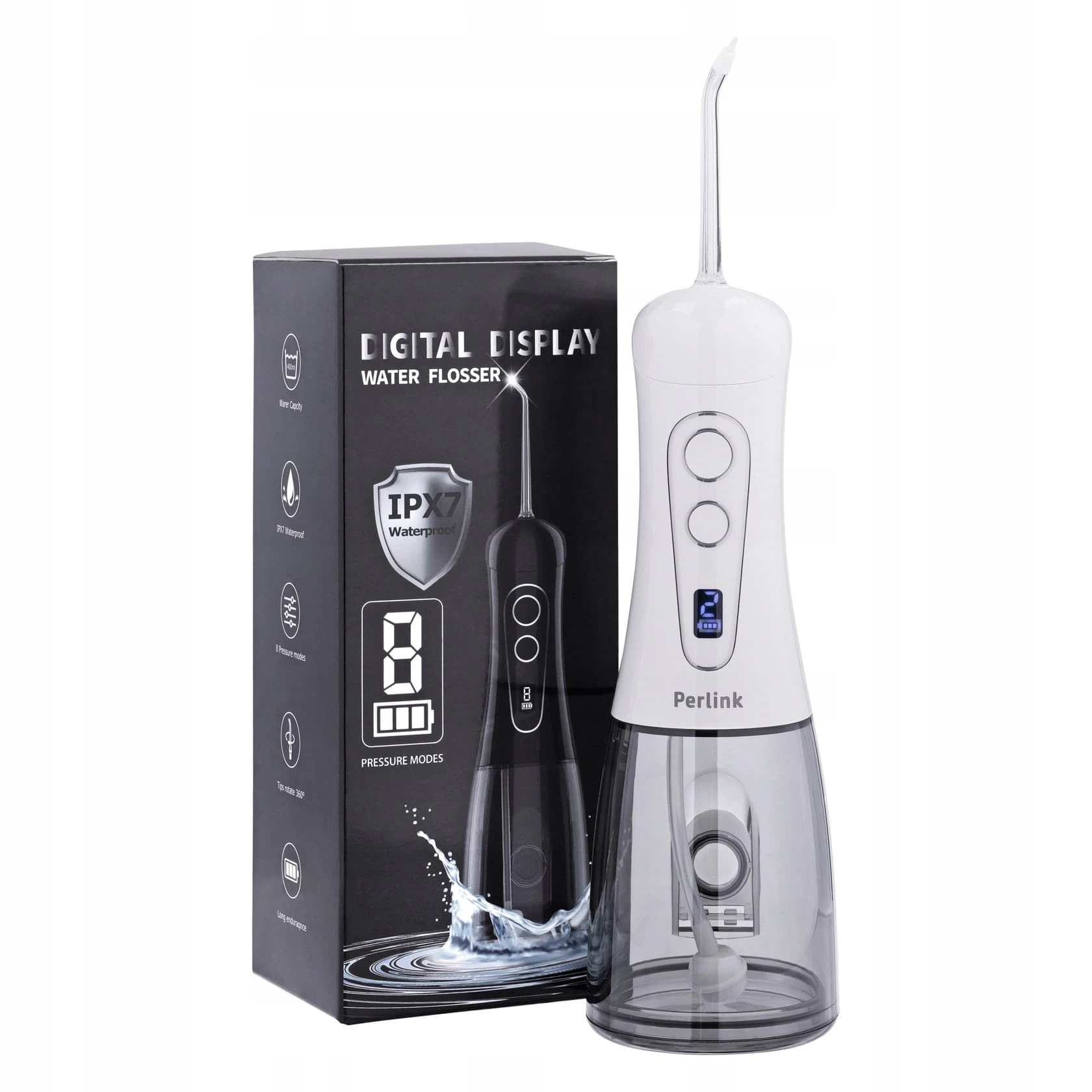Dzięki wodoodporności irygator można bezpiecznie używać w typowych warunkach łazienkowych i myć pod bieżącą wodą. Klasa IPX7 oznacza odporność na krótkotrwałe zanurzenie do 1 metra przez maksymalnie 30 minut; chroni więc przed zachlapaniami, parą i przypadkowym wpadnięciem do umywalki.